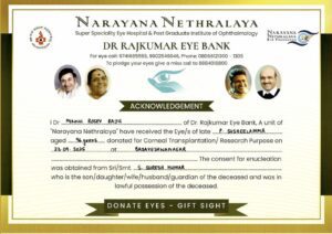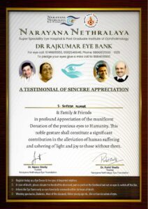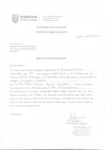 ನಾರಾಯಣ ನೇತ್ರಾಯಲಕ್ಕೆ ಸುಶೀಲಮ್ಮ ಅವರ ಕಣ್ಣುಗಳನ್ನು ಮತ್ತು ರಾಮಯ್ಯ ಮೆಡಿಕಲ್ ಕಾಲೇಜಿಗೆ ದೇಹವನ್ನು ದಾನವಾಗಿ ನೀಡಲಾಗಿದೆ. ಈ ಕುರಿತಾಗಿ ಎಸ್. ಸುರೇಶ್ ಕುಮಾರ್​​ ತಮ್ಮ ಸೋಶಿಯಲ್​ ಮೀಡಿಯಾದಲ್ಲಿ ಮಾಹಿತಿ ಹಂಚಿಕೊಂಡಿದ್ದಾರೆ. ʼʼಮೊನ್ನೆ ನಮ್ಮನ್ನು ಬಿಟ್ಟು ತೆರಳಿದ ನನ್ನಮ್ಮ, ಸುಶೀಲಮ್ಮ ಟೀಚರ್​​ ಹೆಸರಿಗೆ ಸಿಕ್ಕ ಕೊನೆಯ  ಸರ್ಟಿಫಿಕೇಟ್ ಎಂದು ಬರೆದುಕೊಂಡಿದ್ದಾರೆ.