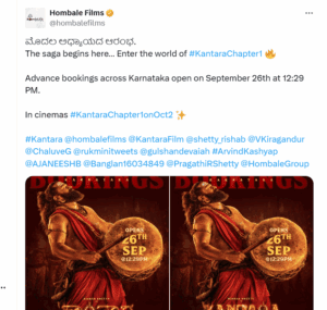 ಕರ್ನಾಟಕಾದ್ಯಂತ ʼಕಾಂತಾರ: ಚಾಪ್ಟರ್ 1′ ಅಡ್ವಾನ್ಸ್ ಬುಕ್ಕಿಂಗ್ ಸೆಪ್ಟೆಂಬರ್ 26ರ 12:29ರಂದು ಆರಂಭವಾಗಲಿದೆʼʼ ಎಂದು ಚಿತ್ರತಂಡ ತಿಳಿಸಿದೆ. ಸದ್ಯ ಕರ್ನಾಟಕದಲ್ಲಿ ಮಾತ್ರ ಅಡ್ವಾನ್ಸ್ ಬುಕ್ಕಿಂಗ್ ಘೋಷಿಸಲಾಗಿದೆ. ಉಳಿದ ಕಡೆಗಳಲ್ಲಿನ ವಿವರ ಇನ್ನಷ್ಟೇ ಪ್ರಕಟವಾಗಬೇಕಿದೆ. ಸೋಶಿಯಲ್ ಮೀಡಿಯಾದಲ್ಲಿ ಈ ಬಗ್ಗೆ ಚಿತ್ರತಂಡ ಘೋಷಿಸಿದ್ದು, ಉಳಿದ ಕಡೆಗಳಲ್ಲಿಯೂ ಶೀಘ್ರದಲ್ಲೇ ಅಡ್ವಾನ್ಸ್ ಬುಕ್ಕಿಂಗ್ ಆರಂಭಿಸುವಂತೆ ಫ್ಯಾನ್ಸ್ ಆಗ್ರಹಿಸುತ್ತಿದ್ದಾರೆ.