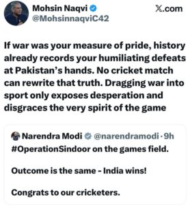 ಪಾಕಿಸ್ತಾನದ ಆಂತರಿಕ ಸಚಿವರೂ ಆಗಿರುವ ನಖ್ವಿ ಈ ಟ್ವೀಟ್ ಅನ್ನು ಸಹಿಸದೆ, ತೀರಾ ಕಳಪೆಯಾಗಿ ಪ್ರತಿಕ್ರಿಯಿಸಿದ್ದಾರೆ. ‘ಯುದ್ಧವು ನಿಮ್ಮ ಹೆಮ್ಮೆಯ ಮಾನದಂಡವಾಗಿದ್ದರೆ, ಪಾಕಿಸ್ತಾನದ ಕೈಯಲ್ಲಿ ನಿಮ್ಮ ಅವಮಾನಕರ ಸೋಲುಗಳನ್ನು ಇತಿಹಾಸವು ಈಗಾಗಲೇ ದಾಖಲಿಸಿದೆ. ಯಾವುದೇ ಕ್ರಿಕೆಟ್ ಪಂದ್ಯವು ಆ ಸತ್ಯವನ್ನು ಪುನಃ ಬರೆಯಲು ಸಾಧ್ಯವಿಲ್ಲ’ ಎಂದು ಅವರು ಪ್ರತಿಕ್ರಿಯಿಸಿದ್ದಾರೆ.