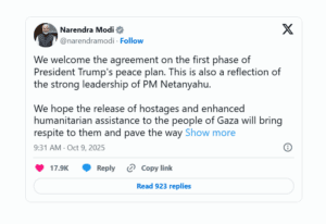 ಪ್ರಧಾನಿ ಮೋದಿ ಅವರು ಎಕ್ಸ್‌ನಲ್ಲಿ ಈ ಬಗ್ಗೆ ಬರೆದುಕೊಂಡಿದ್ದಾರೆ. ಇಸ್ರೇಲ್ ಪ್ರಧಾನಿ ಬೆಂಜಮಿನ್ ನೆತನ್ಯಾಹು ಅವರ ಬಲಿಷ್ಠ ನಾಯಕತ್ವವನ್ನು ಅವರು ಶ್ಲಾಘಿಸಿದ್ದಾರೆ. ಅಧ್ಯಕ್ಷ ಟ್ರಂಪ್ ಅವರ ಶಾಂತಿ ಯೋಜನೆಯ ಮೊದಲ ಹಂತಕ್ಕೆ ಒಪ್ಪಿಗೆ ದೊರೆತಿರುವುದಕ್ಕೆ ನಾವು ಸ್ವಾಗತಿಸುತ್ತೇವೆ. ಇದು ಪ್ರಧಾನಿ ನೆತನ್ಯಾಹು ಅವರ ಬಲಿಷ್ಠ ನಾಯಕತ್ವದ ಪ್ರತಿಫಲವೂ ಆಗಿದೆ” ಎಂದು ಮೋದಿ ಹೇಳಿದ್ದಾರೆ. “ಬಂಧಿತರ ಬಿಡುಗಡೆ ಮತ್ತು ಗಾಜಾ ಜನರಿಗೆ ಹೆಚ್ಚಿನ ಮಾನವೀಯ ನೆರವು ದೊರೆತರೆ, ಅವರಿಗೆ ಪರಿಹಾರ ಸಿಗುತ್ತದೆ ಮತ್ತು ಶಾಶ್ವತ ಶಾಂತಿಗೆ ದಾರಿ ಮಾಡಿಕೊಡುತ್ತದೆ ಎಂದು ನಾವು ಆಶಿಸುತ್ತೇವೆ” ಎಂದು ಹೇಳಿದ್ದಾರೆ.