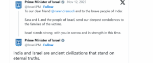 ದೆಹಲಿಯ ಐತಿಹಾಸಿಕ ಕೆಂಪು ಕೋಟೆ ಸಮೀಪ ಸೋಮವಾರ ಉಗ್ರರು ಎಸಗಿದ ಕಾರ್ ಬಾಂಬ್ ಸ್ಫೋಟವನ್ನು ಇಸ್ರೇಲ್ ಪ್ರಧಾನಿ ಬೆಂಜಮಿನ್ ನೆತನ್ಯಾಹು ಖಂಡಿಸಿದ್ದಾರೆ. ಇದೇ ವೇಳೆ, ಪ್ರಧಾನಿ ನರೇಂದ್ರ ಮೋದಿ ಮತ್ತು ಭಾರತದ ಜನರಿಗೆ ತಮ್ಮ ಸಂತಾಪ ಸೂಚಿಸಿದ್ದಾರೆ. ಭಯೋತ್ಪಾದನೆಯನ್ನು ಮಟ್ಟ ಹಾಕಲು ಎರಡೂ ರಾಷ್ಟ್ರಗಳು ಹೊಂದಿರುವ ಕಠಿಣ ನಿಲುವನ್ನು ಅವರು ಒತ್ತಿ ಹೇಳಿದ್ದಾರೆ. ಇಂಥ ಕೃತ್ಯಗಳು ನಮ್ಮ ನಗರಗಳನ್ನು ಗುರಿಯಾಗಿಸಿಕೊಳ್ಳಬಹುದಷ್ಟೇ. ಆದರೆ, ಅದೆಂದಿಗೂ ನಮ್ಮ ದೇಶಗಳ ಮನೋಭಾವವನ್ನು ಮುರಿಯಲು ಸಾಧ್ಯವಿಲ್ಲ ಎಂದಿದ್ದಾರೆ.